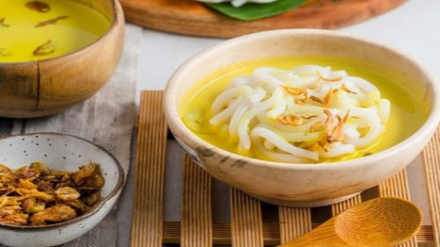 - Sajikan mie beras dengan kuah santan, taburi bawang goreng dan seledri.